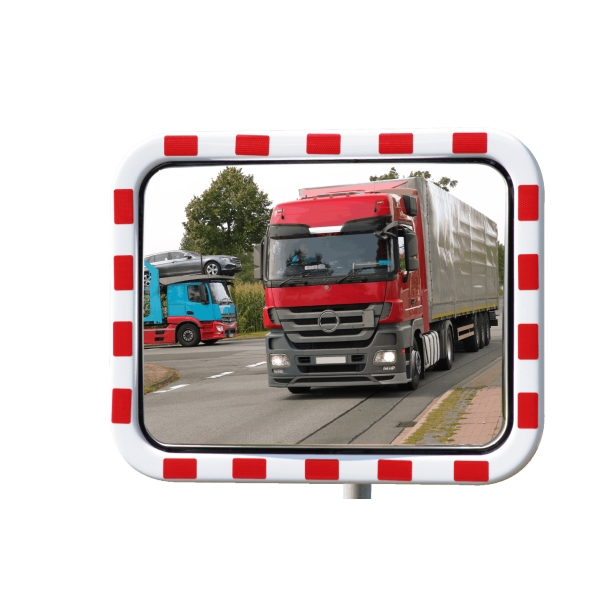 Dopravní zrcadla mají díky bílému rámu s červenou reflexní fólií RA2 mnohem lepší viditelnost, a tím pádem menší riziko nehod.