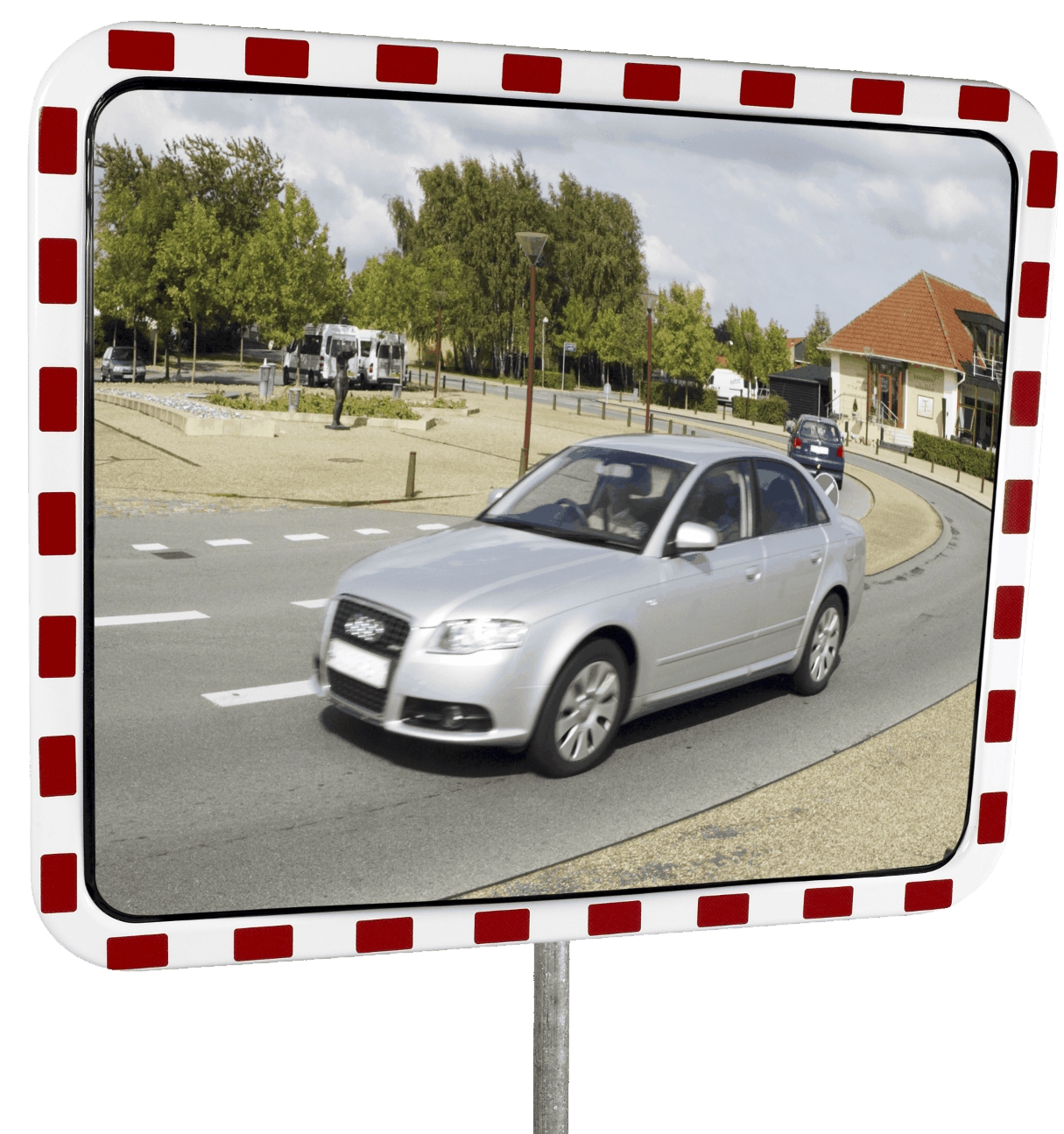 Dopravní zrcadla mají díky bílému rámu s červenou reflexní fólií RA2 mnohem lepší viditelnost, a tím pádem menší riziko nehod.