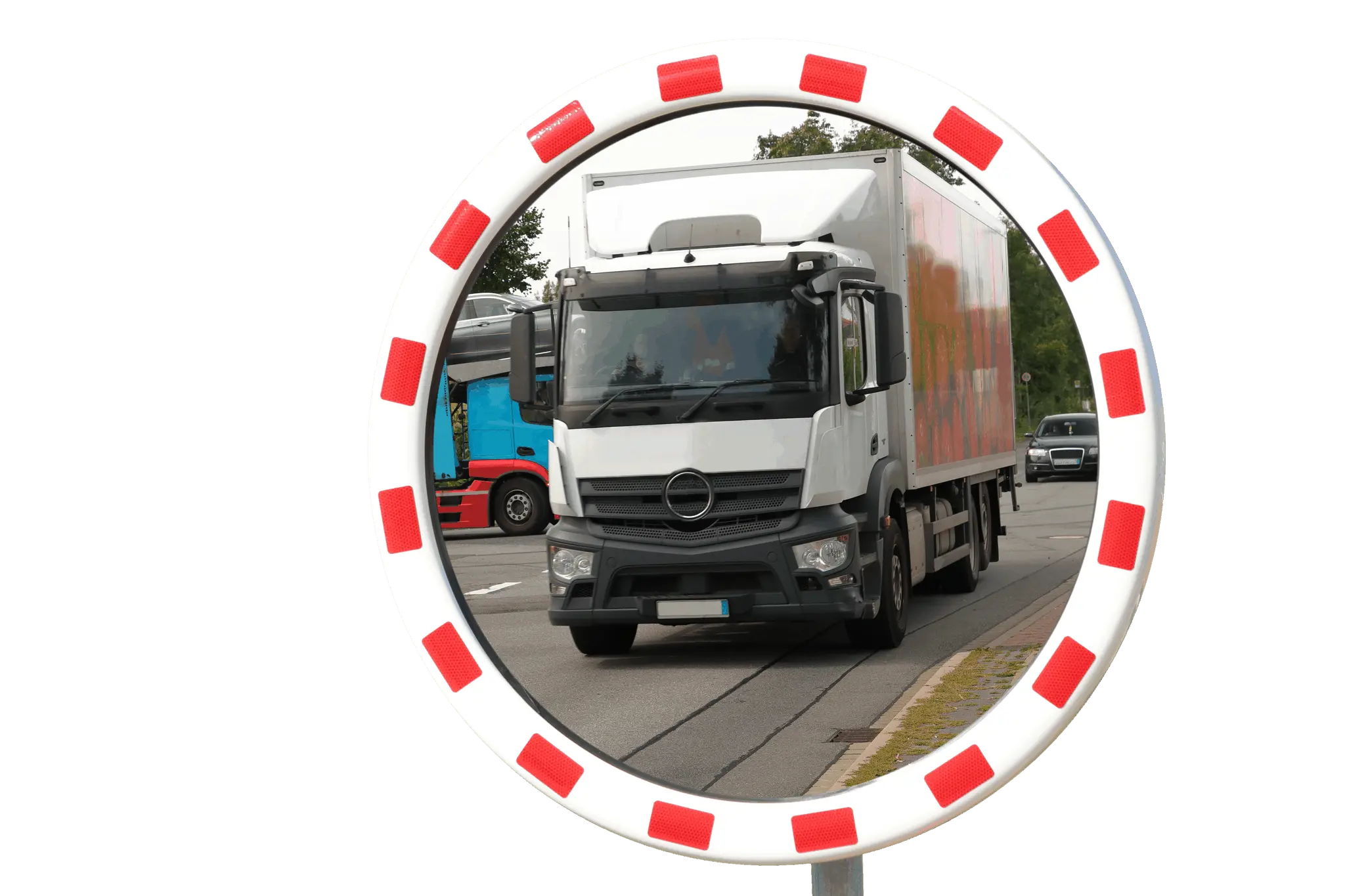 Dopravní zrcadla mají díky bílému rámu s červenou reflexní fólií RA2 mnohem lepší viditelnost, a tím pádem menší riziko nehod.