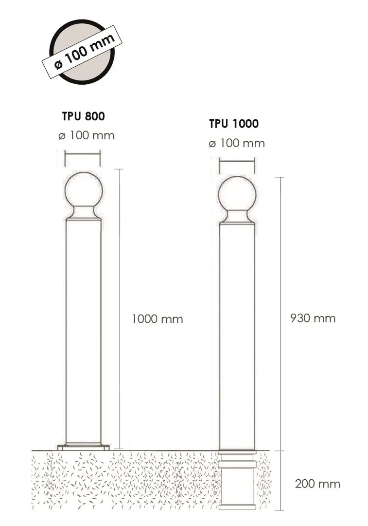 VI-TPU1000RN | Flexibilní sloupek k zabetonování, výška 1130 (930) mm, pr. 100 mm, kulatá hlavice – černá |