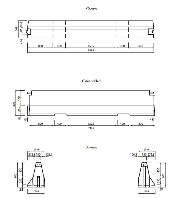 Jednostranné betonové svodidlo TYP80 – průběžný díl je vyroben z vysokopevnostního provzdušněného betonu pevnostní třídy C45/55 a vyhovuje požadavkům stupně agresivity prostředí XF4, XD3 dle normy ČSN EN 206-1.