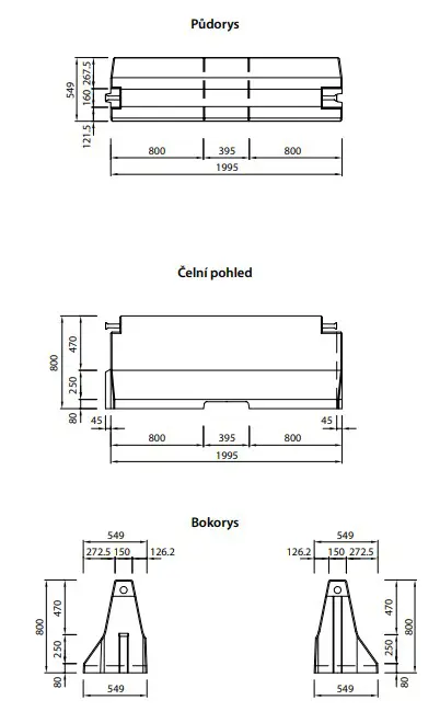 Jednostranné silniční betonové svodidlo TYP100, zkrácené – průběžný díl, 2000×549×1000 mm