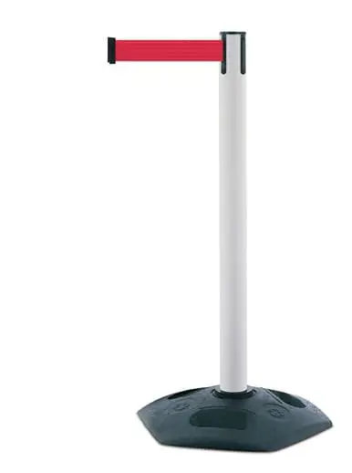 Mobilní zahrazovací sloupek Heavy Duty, bílá – samonavíjecí pásmo 3,65 m, červená