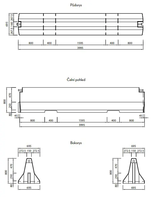 Oboustranné betonové svodidlo TYP80 – průběžný díl je vyroben z vysokopevnostního provzdušněného betonu pevnostní třídy C45/55 a vyhovuje požadavkům stupně agresivity prostředí XF4, XD3 dle normy ČSN EN 206-1.