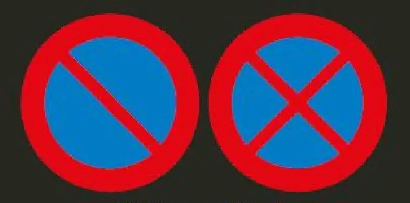 • modré pozadí s červeným rámem a dvěma červenými na sebe kolmými pásy přes střed značení ("Zákaz zastavení")