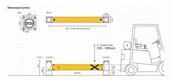 Nárůst délek po 20 cm dává možnost výběru délky zábrany s přesahem přes stojiny regálů. Otočné dvojité opláštění na sloupcích rozptyluje nárazové síly a chrání samotnou konstrukci sloupku před nárazy kovových palet a ostrých vidlic VZV. Pro zamezení nárazu vidlí v nízkých výškách lze zábranu kombinovat s obrubníkem typu ForkGuard.