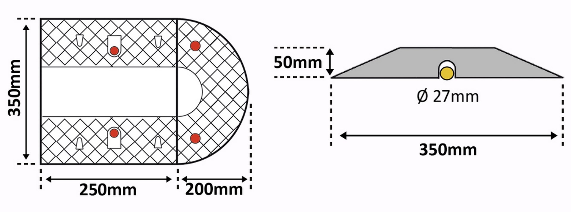 Retardér a kabelový přejezd v jednom. Ochrání kabely, hadice a zároveň sníží rychlost projíždějících vozidel. Retardéry a kabelové přejezdy v jednom využijete na silnicích, parkovištích, u vjezdů do objektů, na stavbách, kulturních akcích. Určeno pro přejezd těžké techniky.