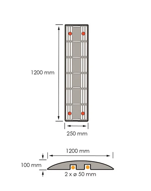 Retardér a kabelový přejezd v jednom – ochrání kabely, hadice a zároveň sníží rychlost projíždějících vozidel. Retardéry a kabelové přejezdy využijete na silnicích, parkovištích, u vjezdů do objektů, na stavbách, kulturních akcích. Tento retardér je určený pro přejezd těžké techniky.