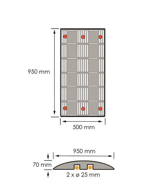 Retardér a kabelový přejezd v jednom – ochrání kabely, hadice a zároveň sníží rychlost projíždějících vozidel. Retardéry a kabelové přejezdy využijete na silnicích, parkovištích, u vjezdů do objektů, na stavbách, kulturních akcích. Tento retardér je určený pro přejezd těžké techniky.