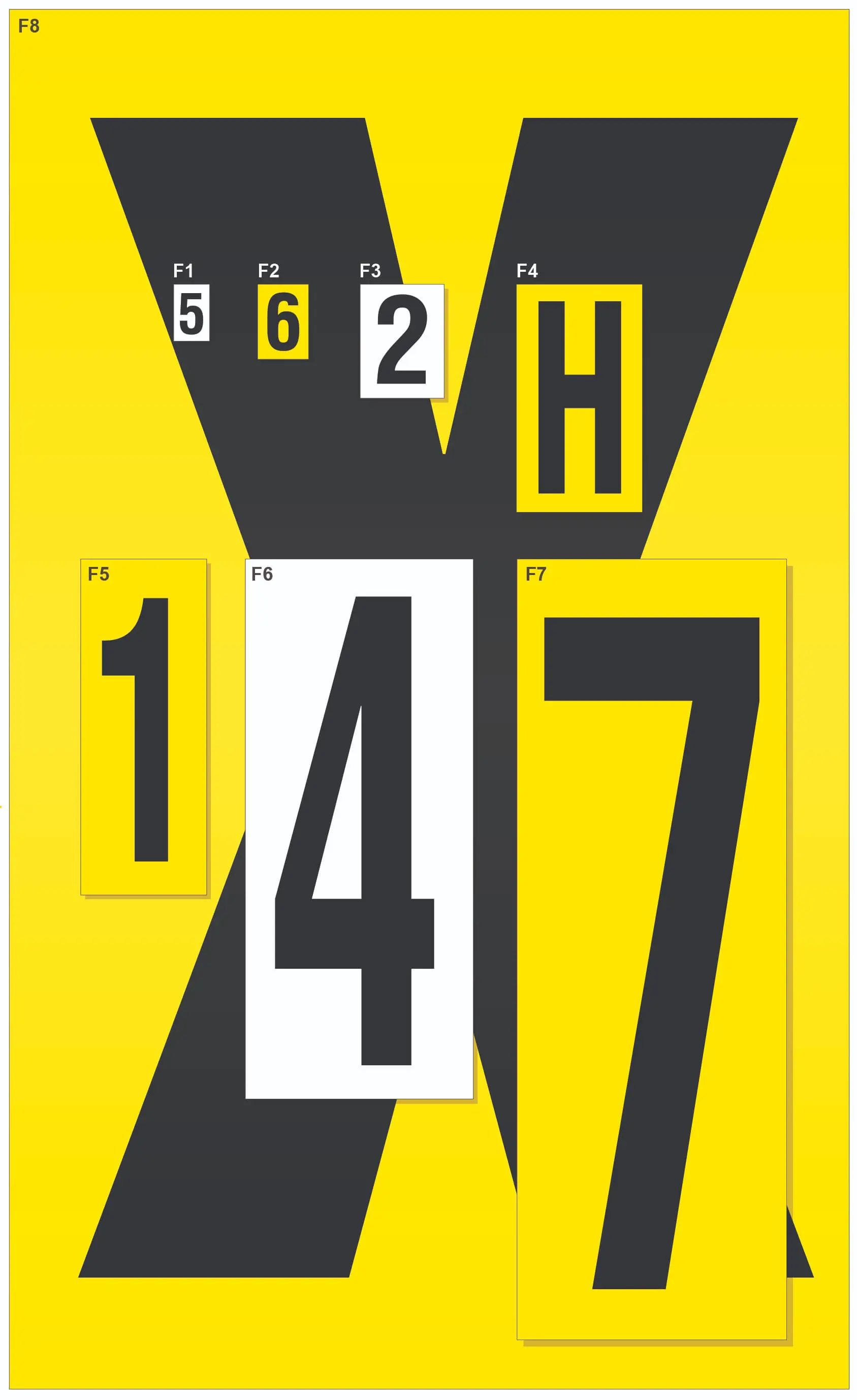Znaky jsou dodávány v osmi velikostech na žlutém nebo bílém podkladu.