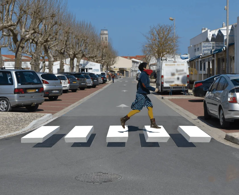Kombinací úhlů a stínování se díky optickému klamu vytváří věrná iluze trojrozměrného povrchu. Ze vzdálenosti 10 až 15 metrů od přechodu se jeví jako betonový hranol, který se vznáší nad vozovkou. Znázornění je natolik věrohodné, že řidič na něj podvědomě reaguje zpomalením, přestože ví, že se jedná o klam.