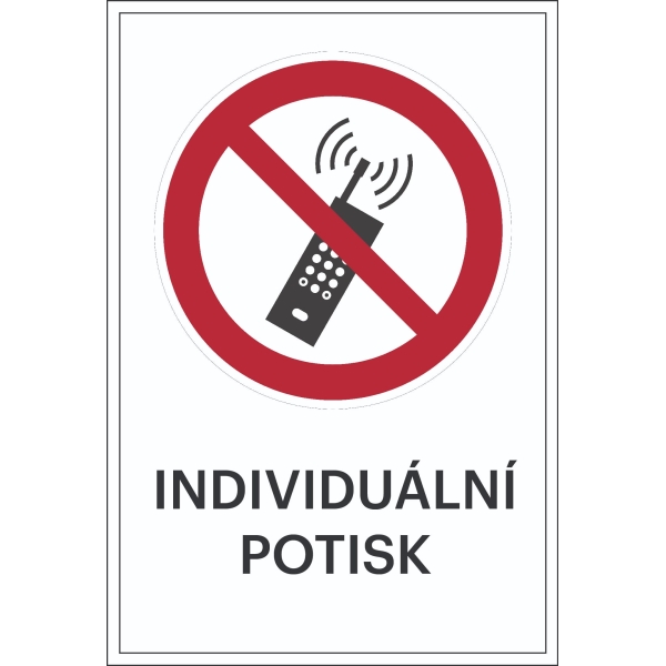 AT-SVK20.DA90.750 | Zákazové značení, mobilní telefony musí být vypnuty, s možností individuálního textu – hliníkový kompozit, 500×750 mm |