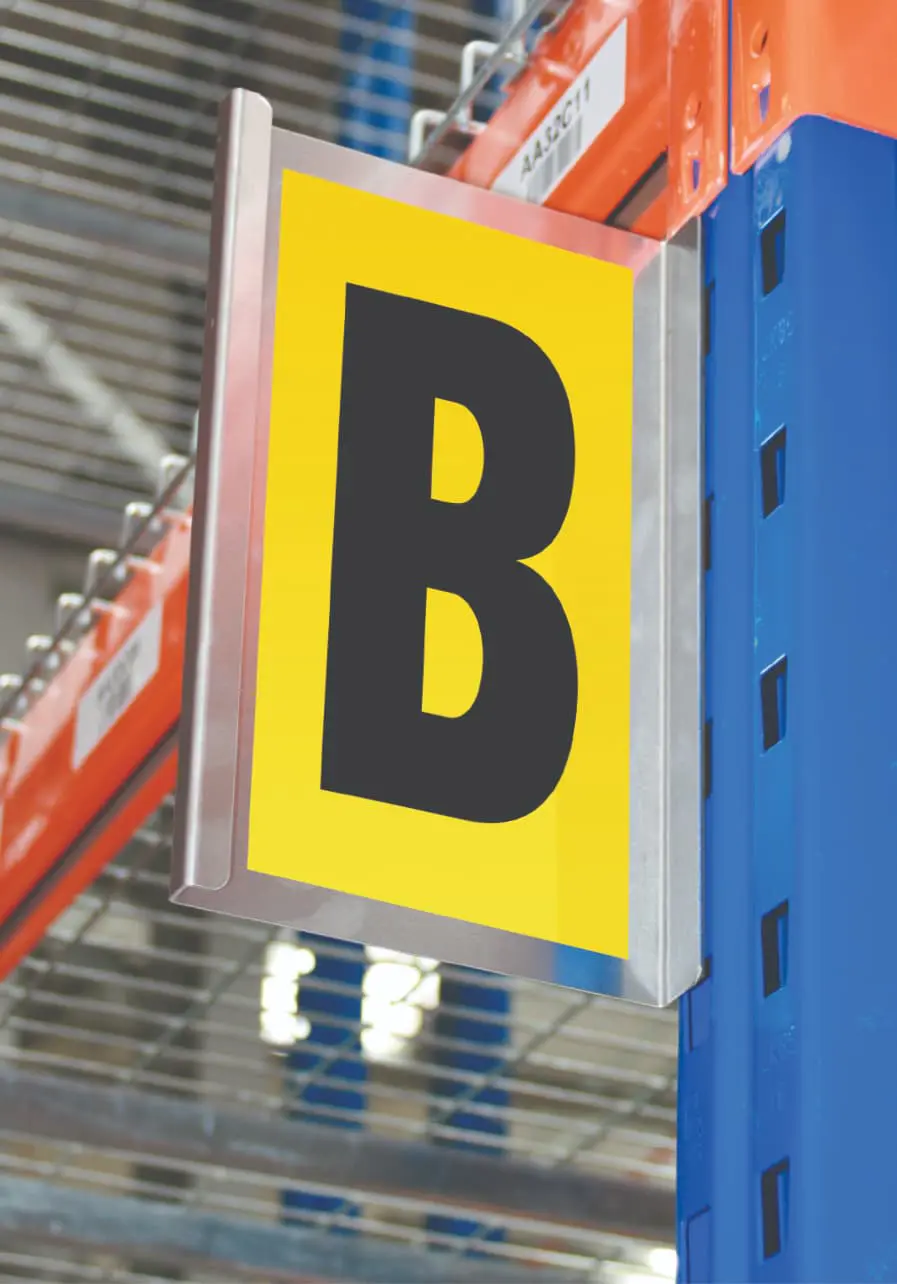 Značení paletových regálů a uliček typu C jsou jasné a viditelné identifikace regálů. Značení lze umístit bez nutnosti vrtání.